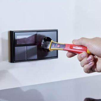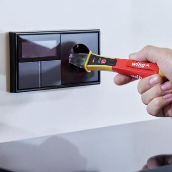 Vor Beginn einer Elektroinstallation müssen Elektriker gewährleisten, dass das Arbeitsumfeld spannungsfrei ist. Um elektrische Wechselfelder testen oder mutmaßliche Fehlerquellen orten zu können, wird ein Spannungsprüfer benötigt. Eine erste Indikation, ob Spannungsfreiheit vorliegt, ist mit dem berührungslosen Wiha Spannungsprüfer dank optischem Signal möglich. Nach dem Einschalten zeigt die permanent grün leuchtende LED die Funktionsbereitschaft an. Liegt eine Spannung vor, leuchtet die rote LED, welche auch bei Tageslicht gut ablesbar ist. Für die Benutzung werden zwei AAA Batterien benötigt, welche im Lieferumfang enthalten sind.